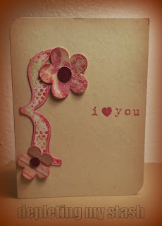 I inked the edges of all embellishments with Momento Rhubarb Stalk. I curled up the edges a bit. The sentiment was in the same ink as well. Let me mention a word or two about the sentiment. Like I've said before, I've been stamping for 20 years. I had these alphabet stamps for a while. I remember that I had to mount them myself and apply the stickers. I haven't used them in years. They were stored in a sandwich bag. Some of the rubber had some off the wood which gave me the grand idea to take off them off. And I tossed the wood. And I have no regrets! I put them sticky side down in a box of cling stamps that I won from Stampin Up. I had to do some trimming on the letters to get them to line up. I love the heart that came with the alphabet. There's a star and a square and numbers! I hope to be using them more now that I can put them on my stamp block and stamp the word at the same time.